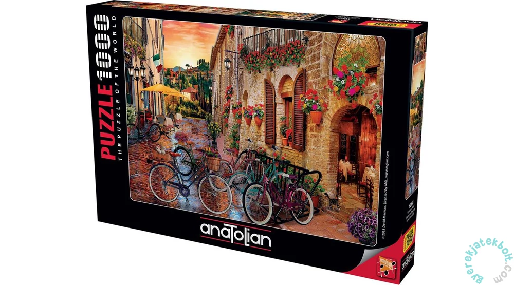 Az Anatolian 1000 db-os puzzle - Biking in Tuscany című David Maclean által festett képén megpihent kerékpárokat láthatunk Toszkána mesés vidékén.