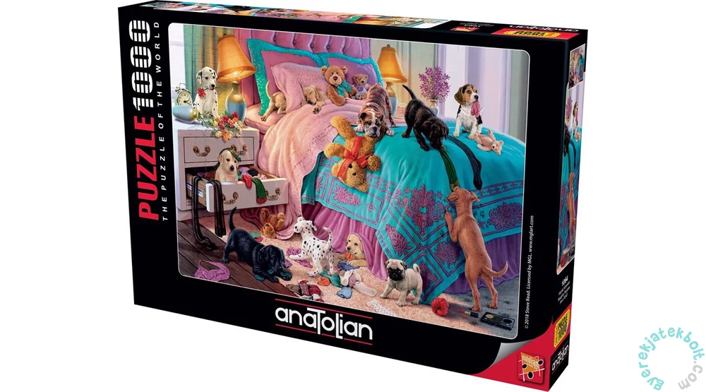 Az Anatolian 1000 db-os puzzle - Naughty Puppies című Steve Read által festett képén rendetlen kutyakölyköket láthatunk, akiknek minden játék.