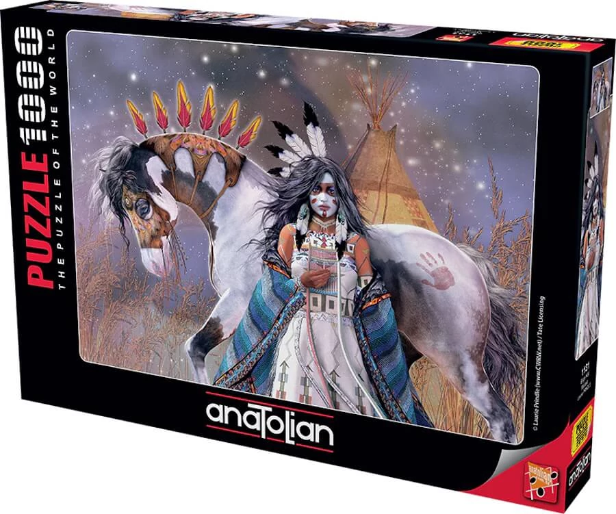 Az Anatolian 1000 db-os puzzle - Wicasa (1131) című képén egy misztikus törzsi figura portréja látható, mely mély gondolatokat és erőteljes szimbolizmust közvetít. A színárnyalatok és az arcvonások finom kidolgozottsága lenyűgöző.