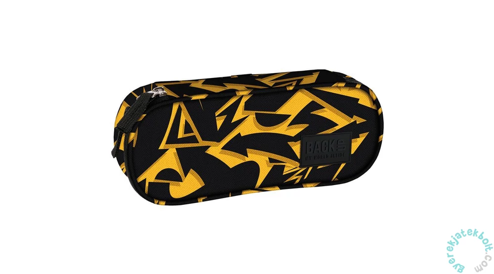 BackUp Geometrikus ovális tolltartó - Sárga nyilakfekete és sárga színösszeállításban, apró nyilakkal és különböző formákkal díszítve. Egyterű belsejében praktikus felhajtható fül is található, melynek egyik oldalán kis cipzáras zseb van, másikon gumifülek tollnak, ceruzának. Az összes írószer elfér benne, amire az iskolában szükséged lehet.