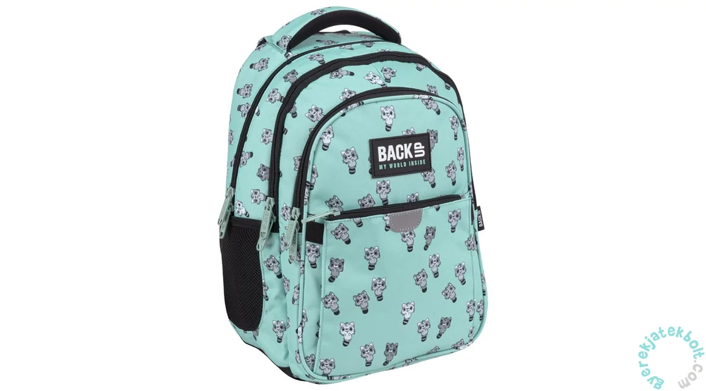 A mosómacis BackUp hátizsák a kisiskolás lányok ruhájának divatos kiegészítője. A hátizsák 3 különböző méretű cipzáras rekesszel, elöl plusz 1 kisebb cipzáras zsebbel és 2 hálós oldalzsebbel rendelkezik. Hátoldala merevített, ergonomikus kialakítású, légáteresztő hálós szivaccsal. Állítható vállpántja szivacsos, légáteresztő hálós fedőréteggel, diszkrét fényvisszaverőkkel ellátott. A belső rekeszekben több kisebb rendszerező zseb található, amikben elfér például a mobil telefon és töltő, fülhallgató, pendrive, kulcs. A tetején lévő megerősített fogantyúval kézben is vihető, a másik fogantyúval felakasztható. A megerősített anyagnak köszönhetően az alsó része erős, strapabíró. A szabvány A/4-es méretű tankkönyv elfér benne, az A/4-es méretű gumis mappa viszont nem. A világos kék színű BackUp hátizsák sok-sok vidám mosómedvével cuki és csajos, tökéletes választás a könnyebb iskolai napokra vagy kirándulásokra!