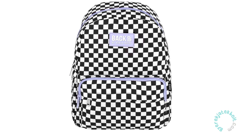 A BackUp iskolatáska, hátizsák - 1 rekeszes - Pepita, lila (PLB7C94F) letisztult lila fehér táska a nagyobb korosztály ruhatárának kiegészítője. A hátizsák egy nagy rekesszel, egy kisebb méretű, cipzáras zsebbel és két kis hálós oldalzsebbel rendelkezik. A légáteresztő hálóval borított, szivacsos vállpánt állítható, a rajta lévő mellkaspánttal pedig még kényelmesebbé teszi viselését. A hátizsák anyaga vízálló, a tetején lévő megerősített fogantyúval kézben is vihető. A BackUp hátizsák remek választás kiránduláshoz és könnyebb iskolai napokra is.