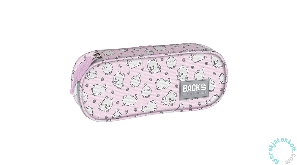 BackUp ovális tolltartó - Puppys édes kiskutyusokkal díszítve. Egyterű belsejében praktikus felhajtható fül is található, melynek egyik oldalán kis cipzáras zseb van, másikon gumifülek tollnak, ceruzának. Az összes írószer elfér benne, amire az iskolában szükséged lehet.