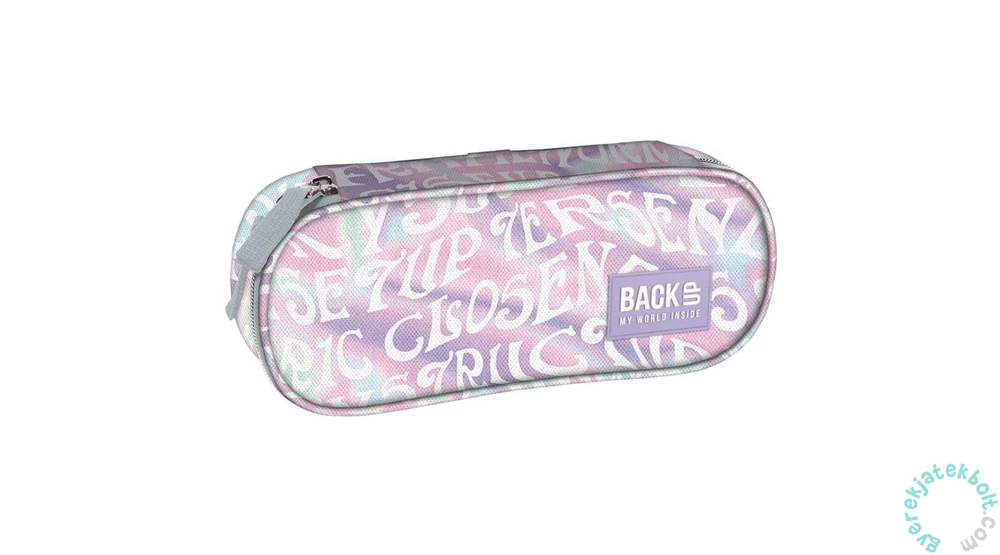 BackUp Pasztell ovális tolltartó - Hullámzó feliratokdivatos pasztell színösszeállításban, hullámzó hatással leírt feliratokkal díszítve. Egyterű belsejében praktikus felhajtható fül is található, melynek egyik oldalán kis cipzáras zseb van, másikon gumifülek tollnak, ceruzának. Az összes írószer elfér benne, amire az iskolában szükséged lehet.