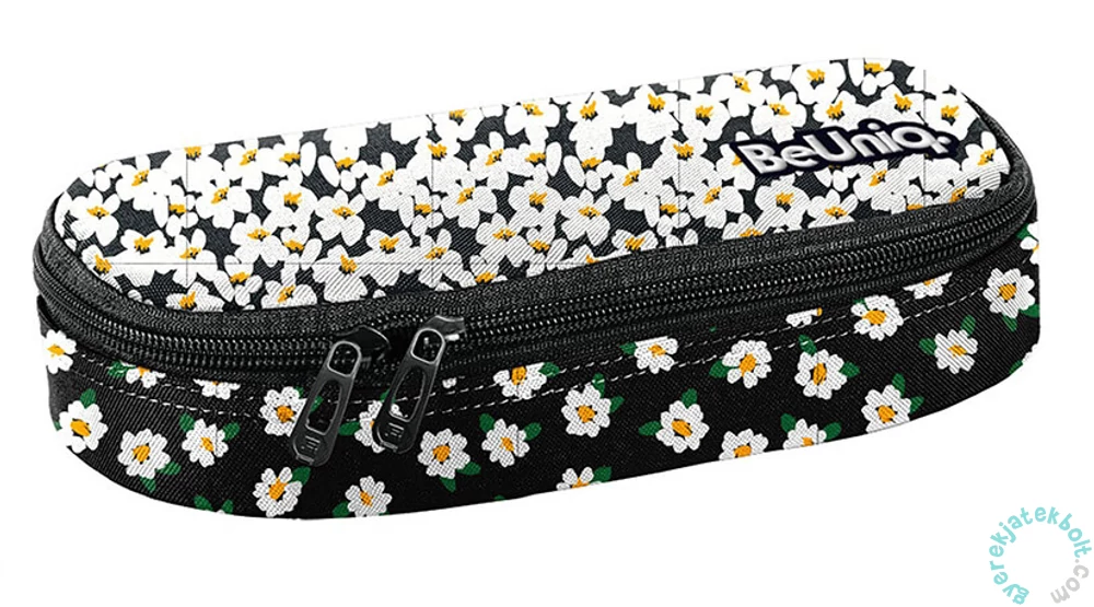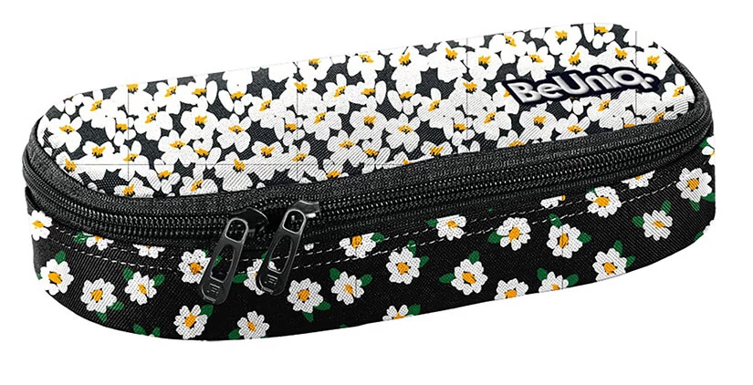 BeUniq ovális tolltartó - fehér virágok (BU24LO-013) belseje egyterű, praktikus cipzáras zseb is található benne, így elfér a tolltartóban az összes írószer, amire az iskolásoknak szüksége van. Cuki, virágos mintájával az iskolatáskák trendi kiegészítője.