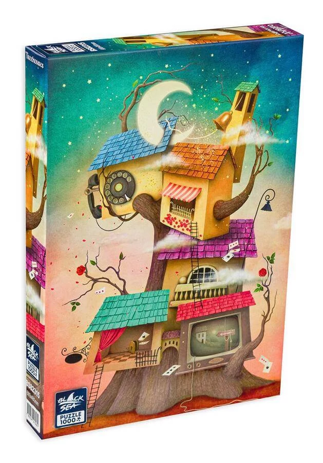 Különleges, kreatív lombházak sorakoznak egy varázslatos fa ágai között, minden ház egyedi karakterrel. A Black Sea 1000 db-os puzzle - Treehouses (BS82315) képe a gyermeki álmokat és kalandvágyat idézi meg.