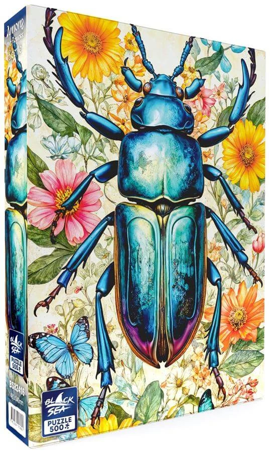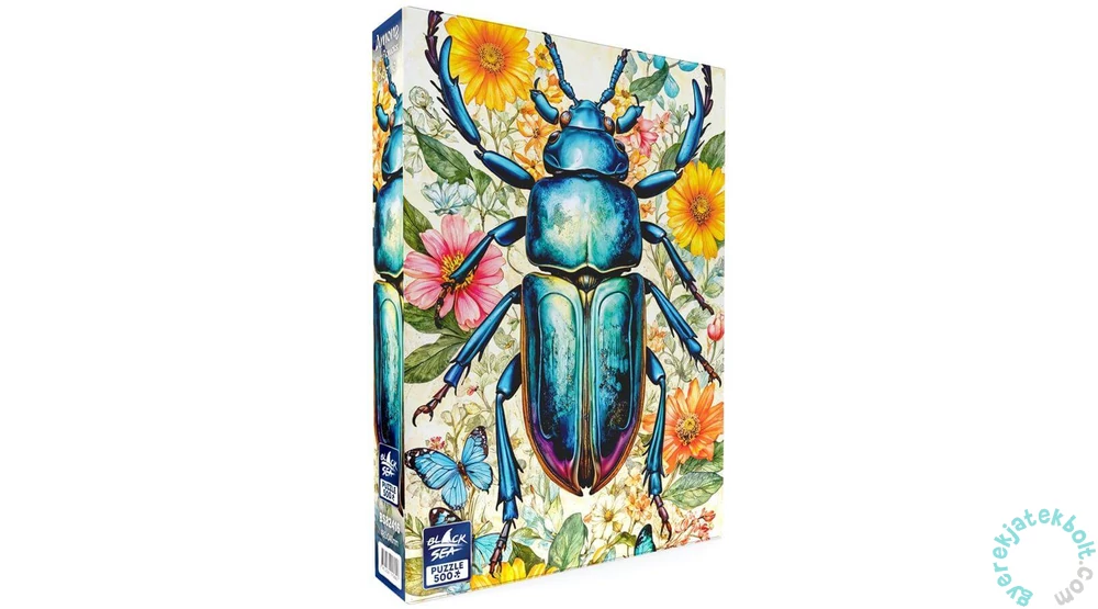Egy fantázia szülte bogár elevenedik meg a Black Sea 500 db-os puzzle - Among the Flowers - Beetle (BS82416) képén meseszép, virágos háttér előtt. A kép finom részletei és élénk kontrasztjai gyönyörködtetik a szemet.