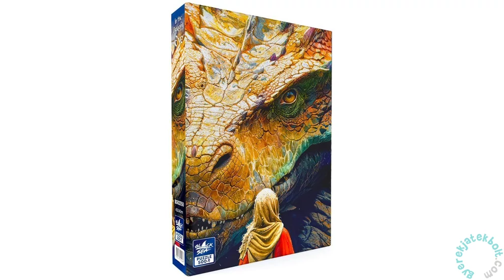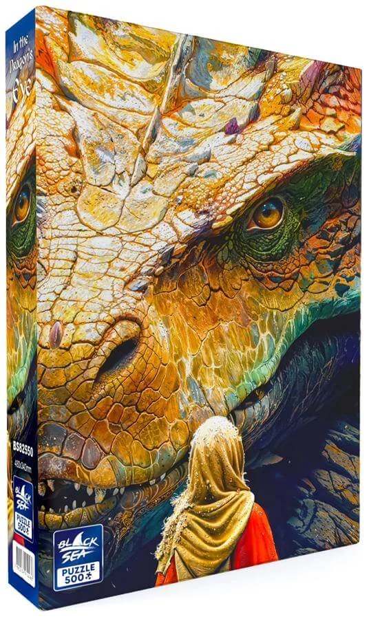 Egy hatalmas sárkány elé járuló női alak elevenedik meg a kirakón. A Black Sea 500 db-os puzzle - In the Dragon's Eye (BS82550) erőteljes és fantasztikus képe lenyűgöz minden fantasy-rajongót.