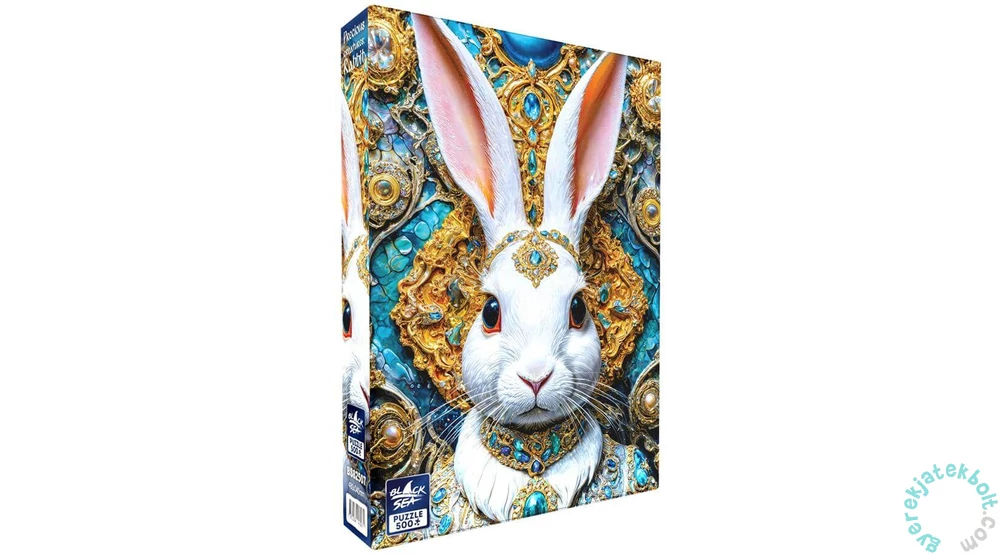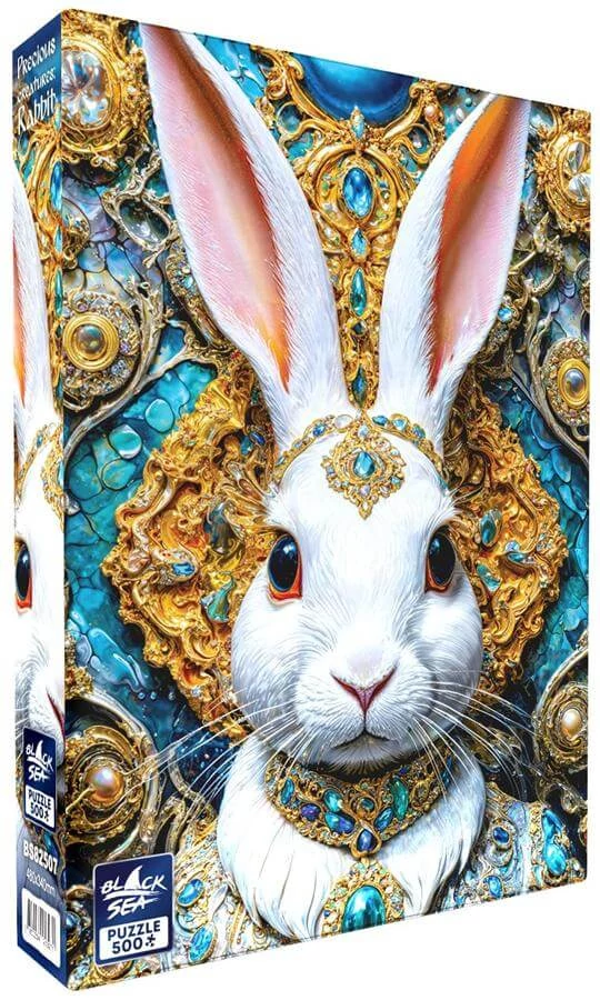 Egy gyönyörű fehér nyúl elevenedik meg a Black Sea 500 db-os puzzle - Precious creatures - Rabbit (BS82507) képén mesés ékszerekkel körülvéve. Az arany és türkiz kompozíció egyszerre modern és klasszikus.