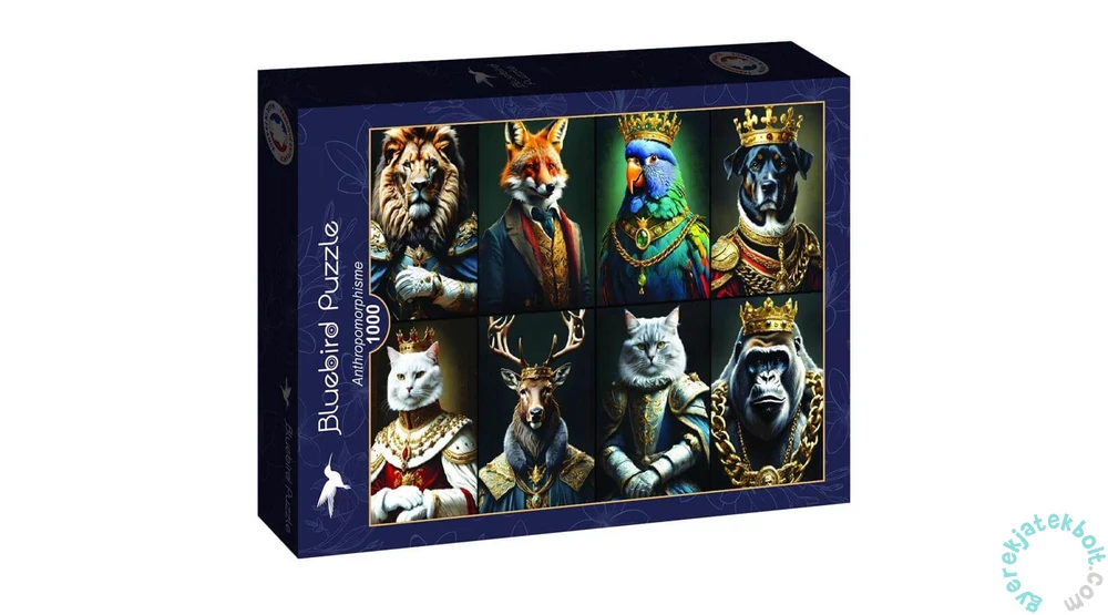 Az 1000 db-os Bluebird puzzle - Anthropomorphisme, azaz antropomorfizmus, élő vagy élettelen dolgok, jelenségek, elvont fogalmak emberi vagy emberinek hitt tulajdonságokkal való felruházása. A képen állatok láthatóak uralkodóként, arisztokrataként ábrázolva.