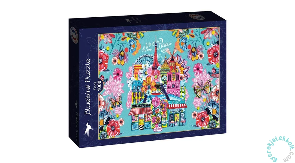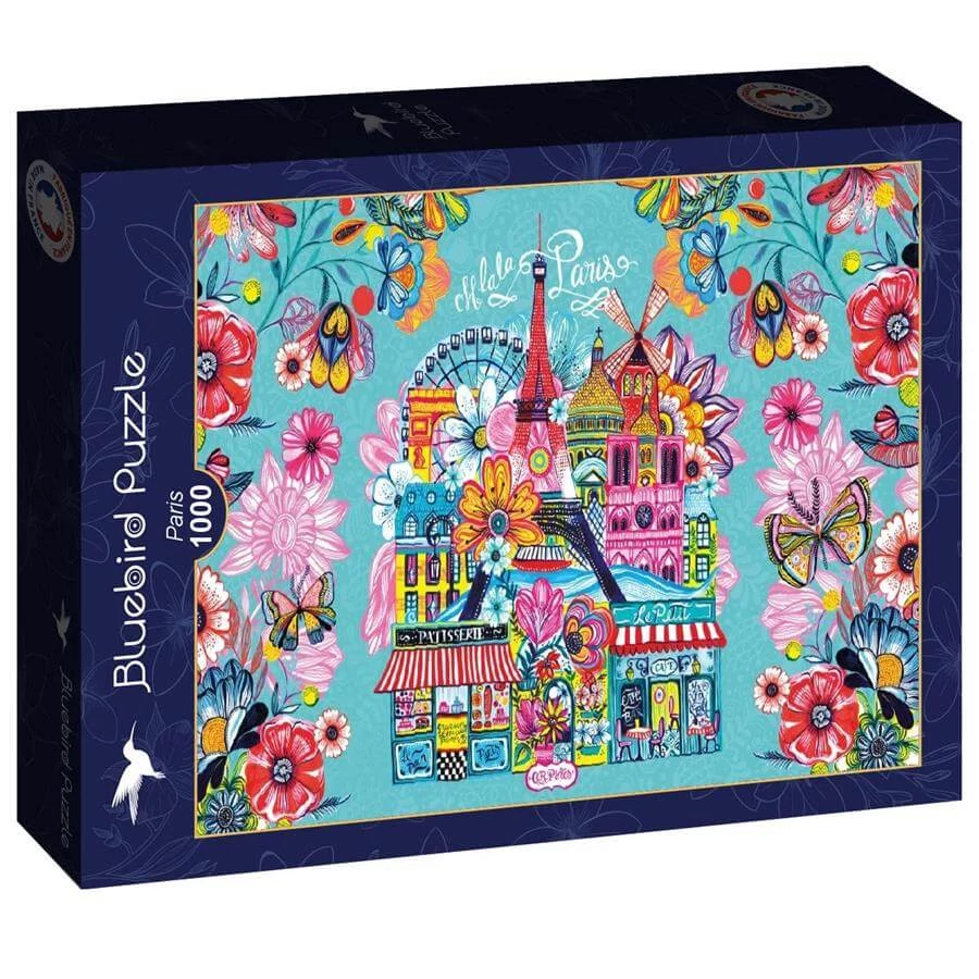 Az 1000 db-os Bluebird puzzle - Paris című képén magával ragad a párizsi hangulat és a vidám színek. A főleg türkiz és rózsaszín színvilágú képen párizs nevezetességei, szimbólumai láthatóak, köztük az Eiffel-torony.