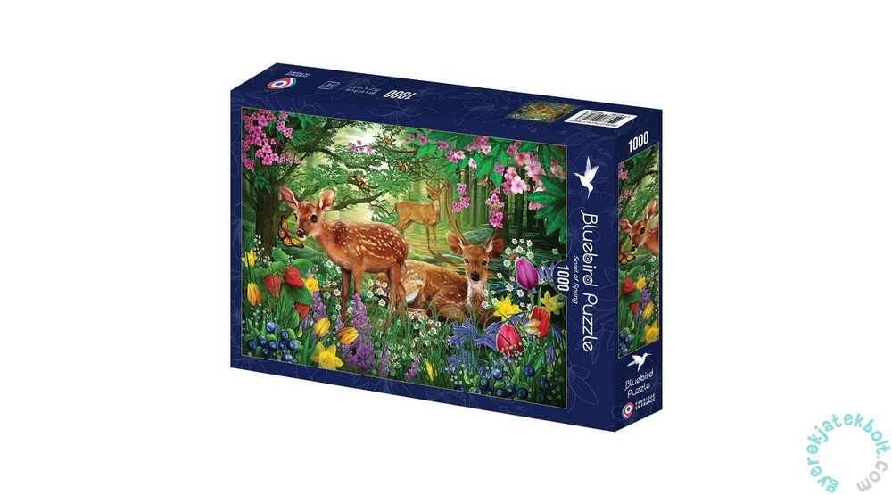Az 1000 db-os Bluebird puzzle - Spirit of Spring című képén magával ragad a tavaszi hangulat: tulipánok, nárciszok, őzikék és pillangók az ébredező erdőben.