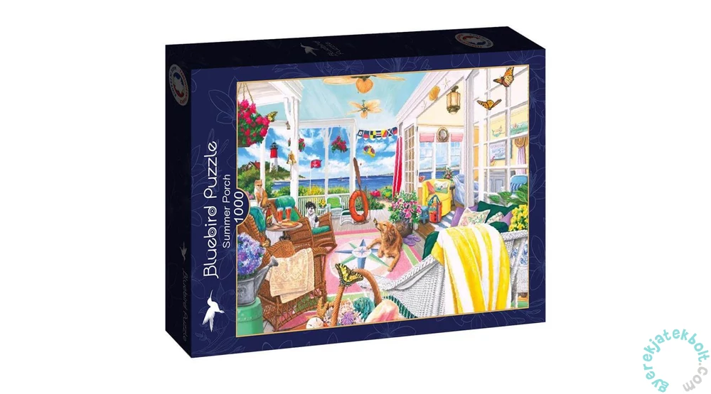 Az 1000 db-os Bluebird puzzle - Summer Porch című képén egy tengerparti házikó teraszán élvezhetjük a nyarat egy cica, kutyák és pillangók társaságában.