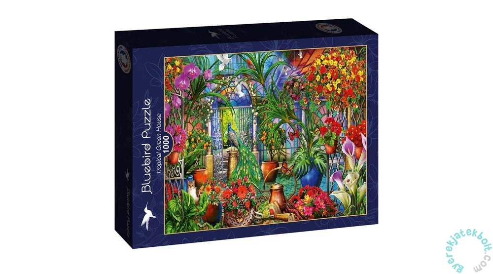Az 1000 db-os Bluebird puzzle - Tropical Green House című képén igazi trópusi hangulat vesz körül. Középen egy páva pózol, körös körül egzotikus növények pompáznak, pillangók és galambok repdesnek, és még egy cica is elbújt ebben a különleges üvegházban.