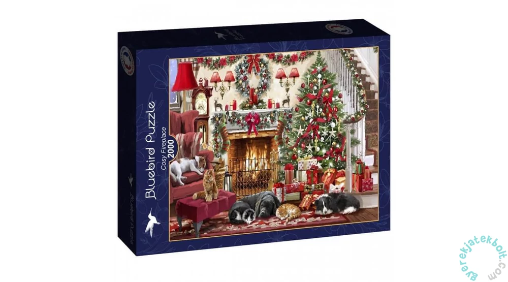 Az 2000 db-os Bluebird puzzle - Cosy Fireplace (90539) című képén a 2000 darabból álló puzzle egy meleg és hangulatos kandallót ábrázol, amely körül meghitt pillanatokat lehet átélni a családdal. Most éppen a ház kedvencei kucorodtak a tűz közelébe pihenni.