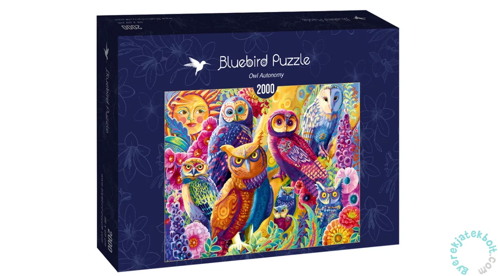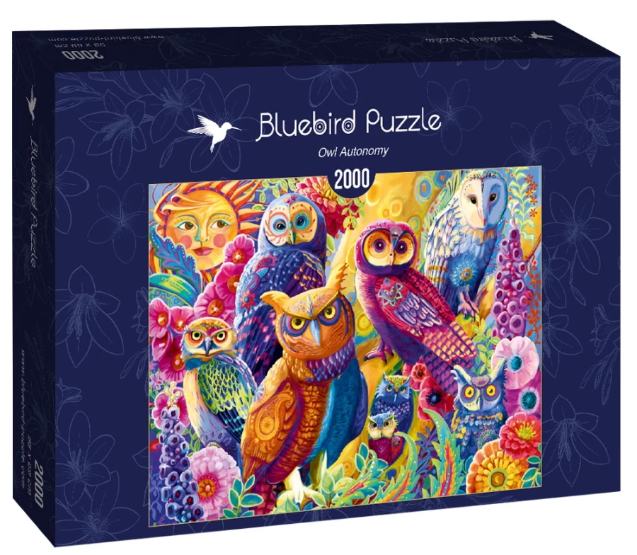 A 2000 db-os Bluebird - Owl Autonomy puzzle képén Laura Audi művész gyönyörű alkotása látható, melyen csodás színekben pompázó baglyok jelennek meg háttérben a Nappal.