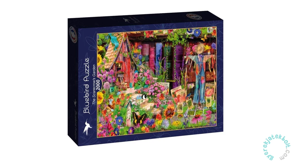 A 2000 db-os Bluebird puzzle - The Scarecrow's Garden című képén egy megelevenedett könyvespolcot láthatunk, ahol egy gyönyörűen burjánzó kertet láthatunk színes virágokkal, pillangókkal, egy rókával, nyuszival és egy madárijesztővel.