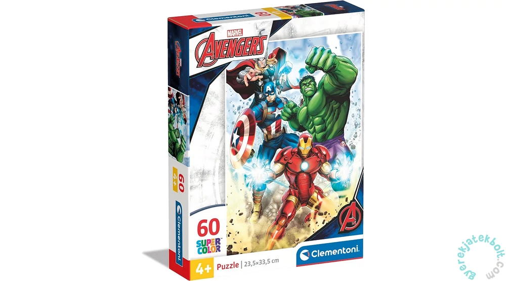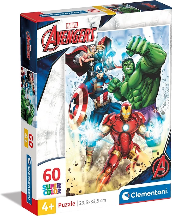 A Clementoni 60 db-os Szuper Színes puzzle Avengers - Bosszúállók című képen Thor, Amerika Kapitány, Hulk és Vasember láthatók.