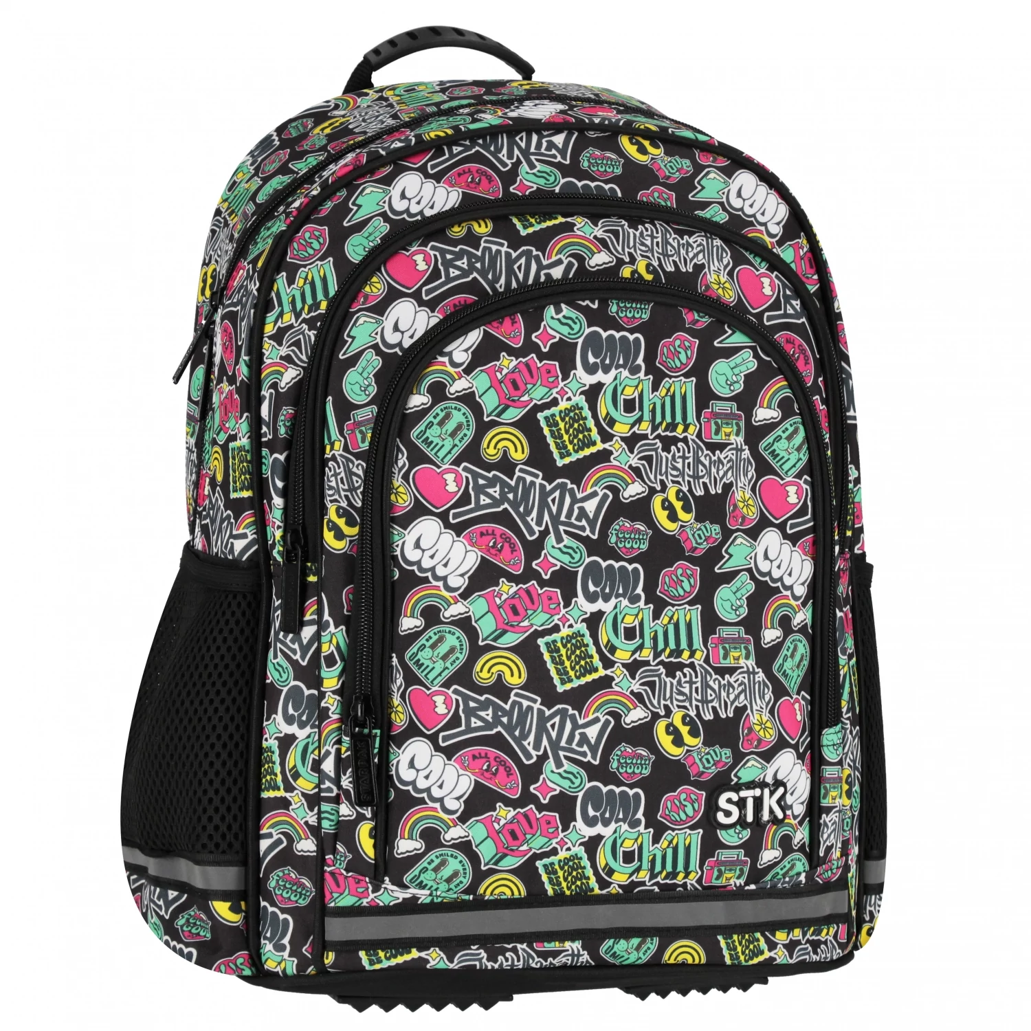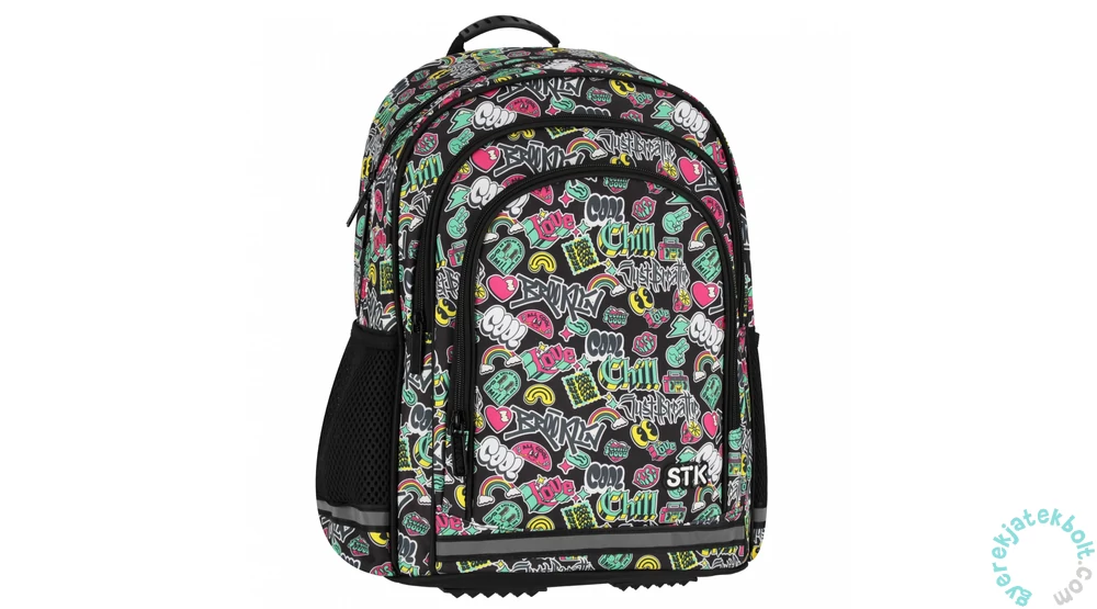 A Cool iskolatáska, hátizsák - 3 rekeszes - Brooklyn előnyei: Tágas kialakítás, a hátizsák 1 nagy rekeszből, 2 nagy elülső zsebből és 1 kisebb zsebből áll az elején. Két oldalsó, megerősített hálós zseb, amelyek ideálisak egy kulacs számára. A cipzárak erősek, hosszú távú használatra tervezve. A hátizsák hát- és vállpántjai ergonomikusak, ami növeli a kényelmet. Vastag, puha vállpántok védelmet nyújtanak a vállaknak, és segítenek egyenletesen eloszlatni a terhelést. A vállpántok magassága állítható, és egy gumiszalaggal megerősített fogantyú segíti a kényelmes hordozást vagy a vállfára akasztást. Az első zseben és a vállpántokon elhelyezett fényvisszaverő elemek növelik a hátizsák éjszakai láthatóságát, így biztosítva a gyermek biztonságát. A két cipzáras rekesz segíti a belső tér jobb rendszerezését, hogy a holmikat kényelmesen el lehessen helyezni. Két húzózsinóros oldalzseb található, amelyek tökéletesek kulacsnak vagy kisebb tárgyaknak. Az elülső zseb ideális kisebb kiegészítők tárolására.