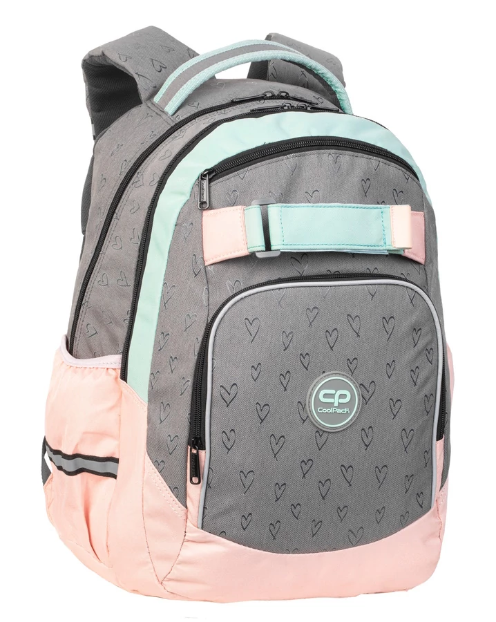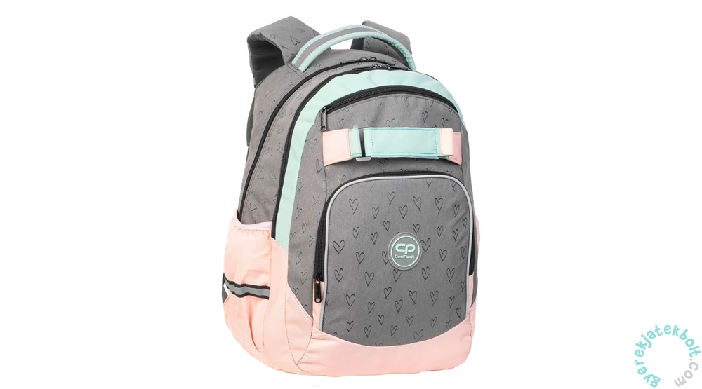 A Coolpack - Loop ergonomikus iskolatáska, hátizsák - 2 rekeszes - Whipped Cream a nagyobb korosztály ruhatárának divatos kiegészítője. A hátizsák 2 különböző méretű, cipzáras rekesszel és két első cipzáras zsebbel rendelkezik. Legnagyobb rekeszében laptoptartó zseb is található, illetve könnyedén elfér benne az A4-es formátum, ami az iskolai tankönyvek hagyományos mérete. AA hátizsák oldalán két zseb található, amelyekben szabadon és biztonságosan tárolhatod a kulacsodat és egyik oldalán még pici cipzáros zsebbel is el van látva. Sőt, a hátizsák számos tulajdonsággal rendelkezik, amelyek elősegítik a praktikus használatot. A táska elején egy tépőzáras rögzítőszalag is található. A párnázott vállpántok állítható hosszúságúak és a tetején lévő megerősített fogantyúval kézben is kényelmesen vihető, valamint az EVA habból készült ergonomikus háttámla kényelmessé teszi a hátizsákot a gyermek számára. A mellkaspánt tehermentesíti a gerincet és javítja a testtartást. Vállpántját fényvisszaverő elemek díszítik a gyermekek biztonságának érdekében. A hátizsákban több kisebb rendszerező is található az apró kiegészítők számára, illetve egy kulcstartó is. A Coolpack - Loop ergonomikus iskolatáska - Whipped Cream szívecskés mintázatával és szép, pasztell színeivel igazán trendi. A táska anyaga vízálló.