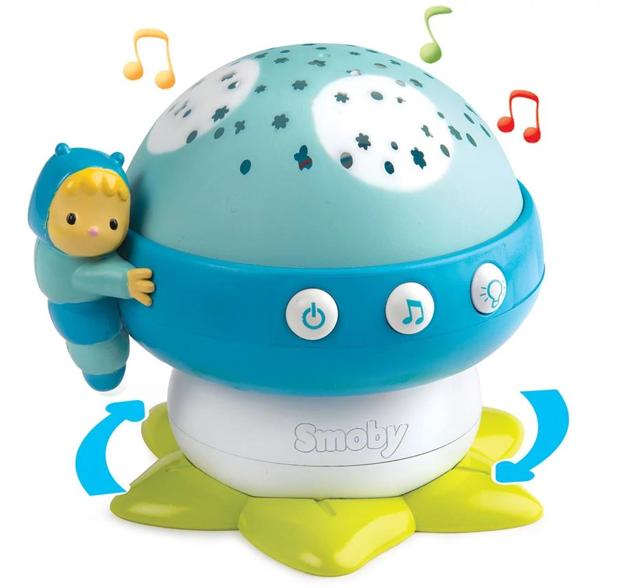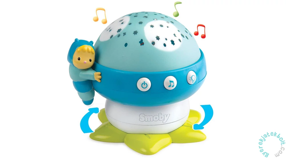 A Smoby Cotoons zenélő gomba projektor - kék (110118) 4-féle dallammal és fényjátékkal ringatja álomba a kicsiket. A játék körbe forogva színes virágokat és pillangókat vetít a falra, közben a színek folyamatosan váltogatják egymást. A gomba kalapjának oldalán kapcsolható a zene és a fény, mellette kedves kis hernyócska vigyázza a gyermekek álmát. A Smoby Cotoons zenélő gomba projektor 2 db 1,5 V-os LR06/AA jelű elemmel működik, melyet a csomagolás nem tartalmaz.