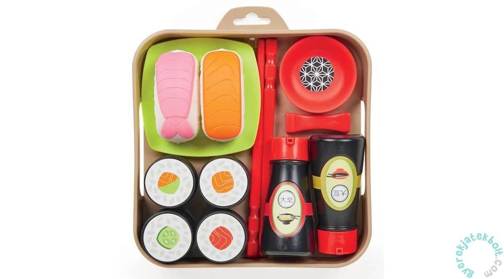 A készlet tartalmaz egy tálcát a sushi számára, 1 db tányért, 2 db pálcikát, 1 db csészét, 2 db szójaszószt, 2 nigirit és 4 db sushit.