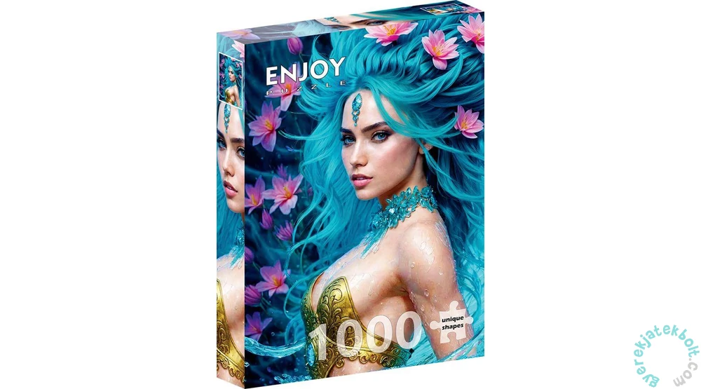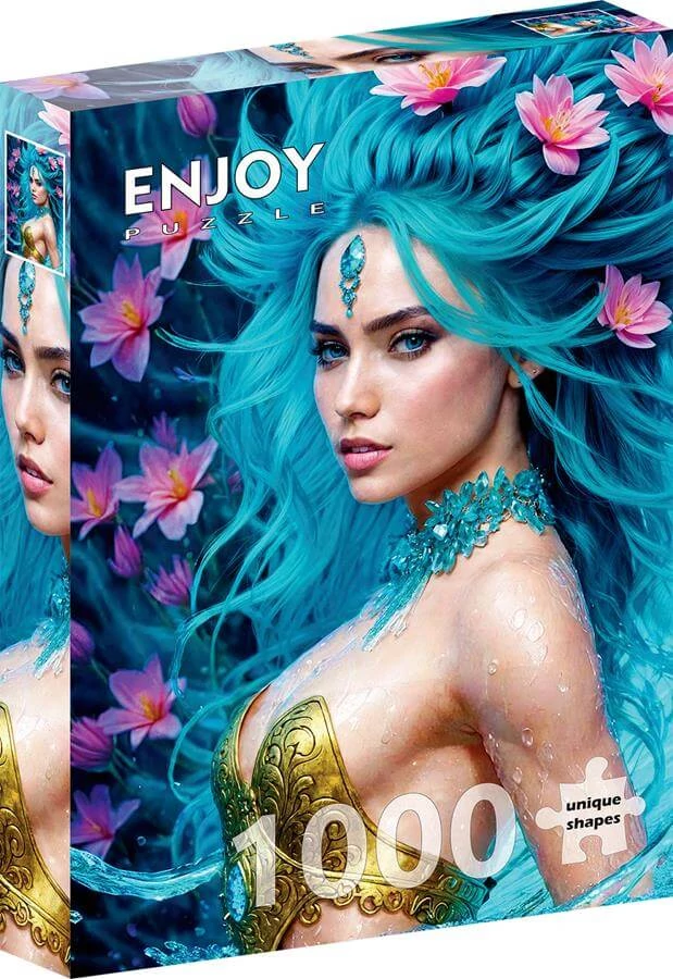 Enjoy 1000 db-os puzzle - Water Element (2173) a kirakott képén egy királynőt ábrázol, aki a víz elem istene. A lány tekintete, kék színű haja a vízi virágokkal, a víz természetének szépségét és erejét jeleníti meg.