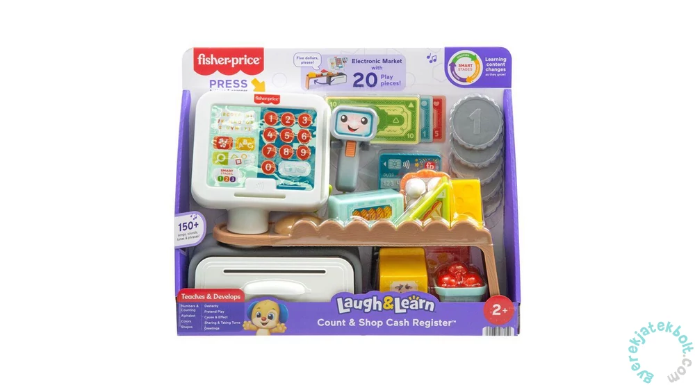 A Fisher-Price Kacagj és fejlődj - Pénztárgép (JGW98) egy izgalmas, interaktív játék, amely játékosan ismerteti meg a kicsiket a számokkal, a számolással, az ábécével, a színekkel, a formákkal és még sok minden mással. A gyerekek 15 gombot nyomkodhatnak, használhatják a szkennert, és közben több mint 150 dal, hang és kifejezés kel életre. A készletben a pénztárgép mellett 20 kiegészítő is helyet kapott, így a szerepjátékos történeteknek csak a gyerekek fantáziája szabhat határt.