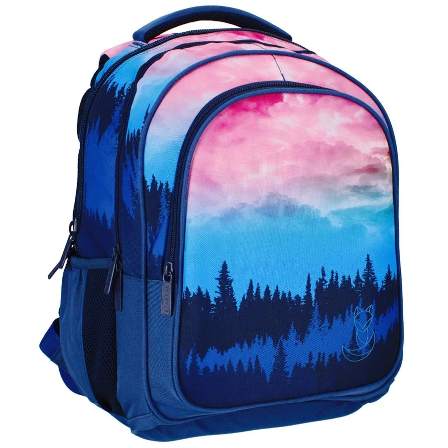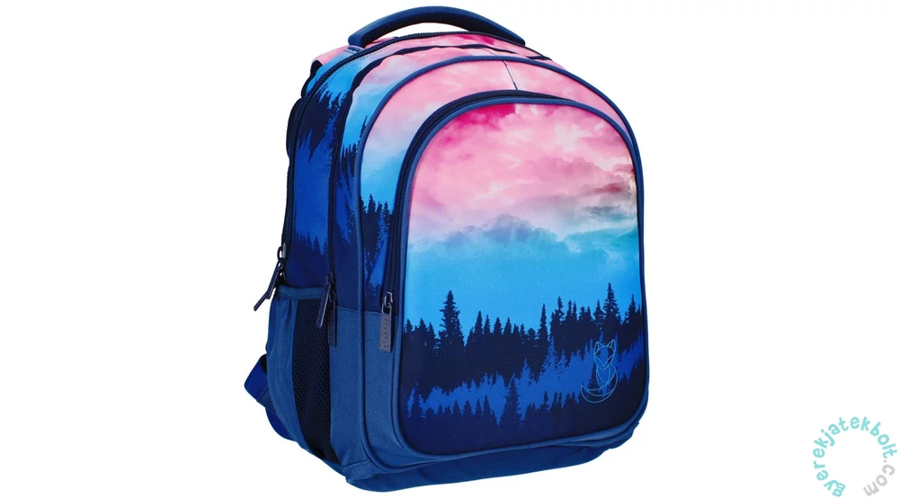 A nagyméretű Forest 2 rekeszes iskolatáska, hátizsák a nagyobb korosztály számára készült. A hátizsák 2 nagyobb méretű rekesszel, egy első cipzáras és két kisebb hálós oldalzsebbel rendelkezik. Hátoldala ergonomikus kialakítású, légáteresztő hálós szivaccsal. A belső zsebekben több kisebb rendszerező zseb, kulcstartó és mobiltartó is található. Állítható vállpántja szivacsos, fényvisszaverőkkel ellátott, alsó része szivaccsal megerősített. Anyaga vízálló. Trendi és varázslatos kék-pink színátmentes erdő mintázattal dekorált, praktikus hátizsák tinédzsereknek. Válaszd a hozzá illő mintázatú tolltartót!