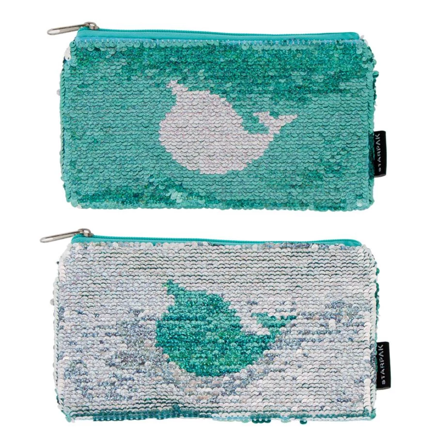 A Dupla flitteres neszesszer - türkiz-ezüst színben halacskás dekorációval az iskolatáska remek kiegészítője. A kozmetikai kis táska cipzárral zárható, tarthatunk benne pipere készletet, vagy akár pénztárcaként is használható.
