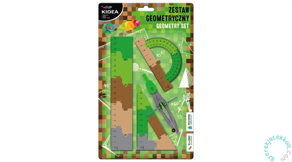 Kidea 4 db-os geometriai készlet - Zöld (ZGPA20CM4KA) iskolai vagy otthoni használatra. A készlet 3 különböző vonalzóból (egy 20 cm-es egyenes, egy 10 cm-es háromszög és egy 10 cm-es szögmérős) és egy körzőből áll. A készlet elemei strapabíróak, a vonalzók kopásmentes skálával rendelkeznek. Ismerd meg a Kidea termékcsaládjába tartozó, számos praktikus és egyedi megjelenésű iskolaszert!