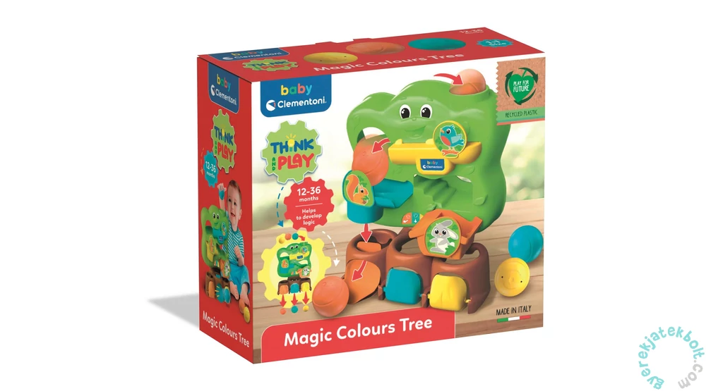 Clementoni Baby - Varázsfa bújócska (17580) Vidám és színes fa, tele csúszdákkal, labdákkal és rekeszekkel, amelyek játékos módon fejlesztik a gyerekek logikus gondolkodását és kézügyességét. Három különböző méretű golyó hullik a fa törzsébe, majd mintha varázslat érné őket a saját színükhöz illő ajtó mögött bukkannak fel. Segíti a gyerekeket a kézügyesség (labdafogás, ajtónyitás), a szem-kéz koordináció (labdák elhelyezése a lyukakban) és a logikus gondolkodás fejlesztésében. Vidám, játékos dizájnja, valamint a fát körülvevő kedves madárkák szerethető karakterré teszik ezt a különleges játékot.