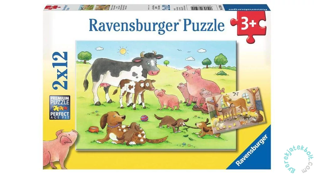 Két kedves állatkás jelenet a farmról. A Ravensburger 2 x 12 db-os puzzle - Boldog állatcsaládok (07590) kirakó képein tehenek, malacok, kutyák, cicák, csirkék és lovak elevenednek meg.