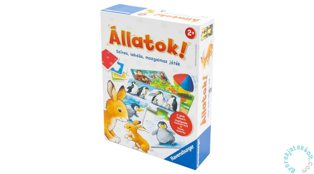 A Ravensburger - Játszva tanulva - Állatok társasjáték (24781) egy vidám, könnyen játszható oktatójáték, amely segít a gyerekeknek megismerni az állatokat és azok élőhelyeit. Egyszerű szabályainak köszönhetően gyorsan bele lehet merülni, miközben a gyerekek szórakozva tanulnak a természet világáról. A játék fejleszti a megfigyelést, koncentrációt és finommotorikát.