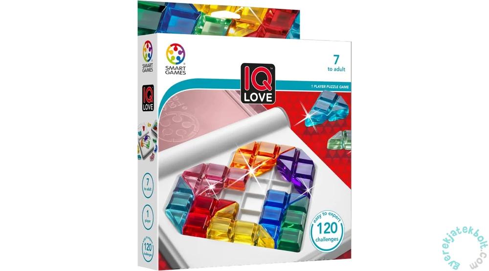 Smart Games - IQ Love logikai játék - "Szívesen" megoldanád ezt a színes fejtörőt? Be tudod rakni a játéktáblába az összes, ragyogó alkatrészt? A 120 feladvány garantálja a szeretetteljes, hosszú távú kapcsolatot. Szuper, utazóbarát kirakójáték kétoldalú játéktáblával. A játék fejleszti a logikai gondolkodást, vizuális észlelést, probléma megoldást, térbeli tájékozódást és a koncentrációt.