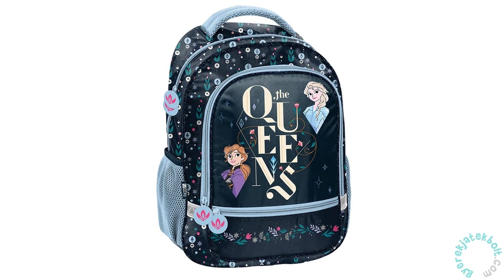 Jégvarázs hátizsák, iskolatáska - Queens elején a mesebeli lányok láthatók, Elsa és Anna. Az iskolai felszerelést két különböző méretű, cipzáras zsebbe lehet pakolni. Elején egy kisebb zseb található, kétoldalt egy-egy hálós zsebben tárolható például az üdítős kulacs. A táska kézben és háton is kényelmesen hordható, hátoldala szivacsos, profilozott kialakítású. Állítható vállpántja párnázott a kényelmesebb viselés érdekében. A hátizsák anyaga vízlepergető, alja merevített, megerősített anyagú. A gyermekek biztonságának érdekében több helyen fényvisszaverő csíkokkal van ellátva. Jégvarázs hátizsák, iskolatáska - Queens mintákkal díszített hátizsák remek választás lazább iskolai napokon vagy kirándulások alkalmával.