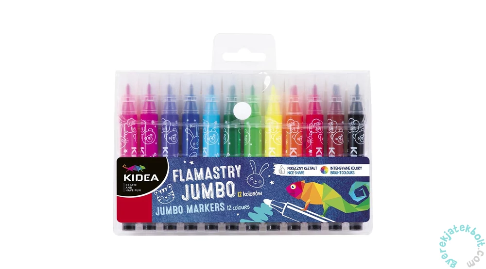 A Kidea 12 színű Jumbo filctoll szettel csodás képek készíthetőek! A gyönyörű, élénk színű, vastag filctollak könnyen kézbe foghatók, hegyük is vastagabb, így nagyobb felületek színezésére is alkalmasak.
