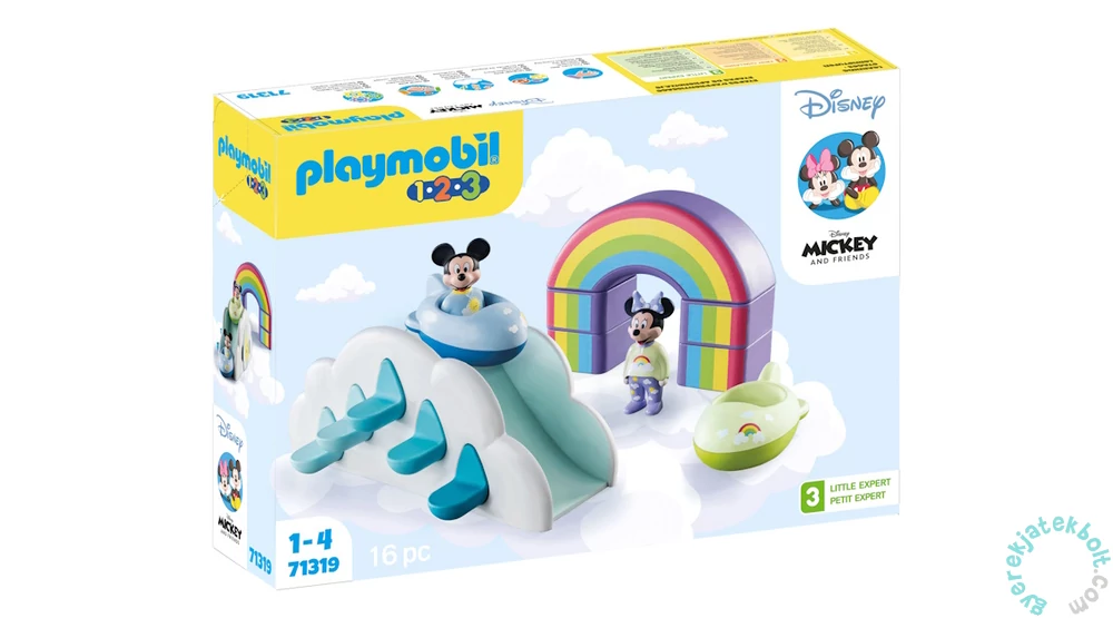 A Playmobil 1.2.3 - Disney - Mickey & Minnie felhő otthona (71319) játékszett megannyi izgalmas felfedeznivalót tartogat a kisgyermekek számára és több dimenzióban is támogatja a fejlődésüket. Az egyes elemek sokféle kombinációs lehetősége ösztönzi a kicsik kreativitását. A szivárvány megfordítva nemcsak hintaként vagy csörgőként használható, hanem a szivárványtéglákból - tetszés szerint vagy a szivárványminta alapján válogatva - torony vagy akár egy boltíves kapu is összeállítható. A többféle variációs lehetőség, az esőcseppek beillesztése a felhőházba fejleszti a finommotoros és a kognitív készségeket egyaránt. A beillesztett esőcseppek ráadásul lépcsőt is képeznek a figurák számára, ami újabb játék lehetőséget kínál. A Mickey és Minnie Mouse figurák beültethetők a pizsamájukkal megegyező színű repülőbe és indulhat is a repülőverseny, és a felhőotthon tetején való csúszdázás! A ház ajtaja nyitható, a Mickey és Minnie figurák akár repülőjükkel együtt is belehelyezhetők a lefekvés idejére. A szivárvány rázásával megszólaló csörgő funkció és a megfordításával elérhető hinta funkció segíti az ok-okozati összefüggések felfedezését és megértését. Az álomrepülők a valóságban úsznak a vízen. Az imádnivaló Mickey & Minnie Mouse Disney figurák szerepjátékokra és kreatív mesékre is invitálnak. A nagy darabokból álló játékrészeket könnyen meg tudják fogni a kis kezek. A játék méretei: 28 x 12 x 15 cm.