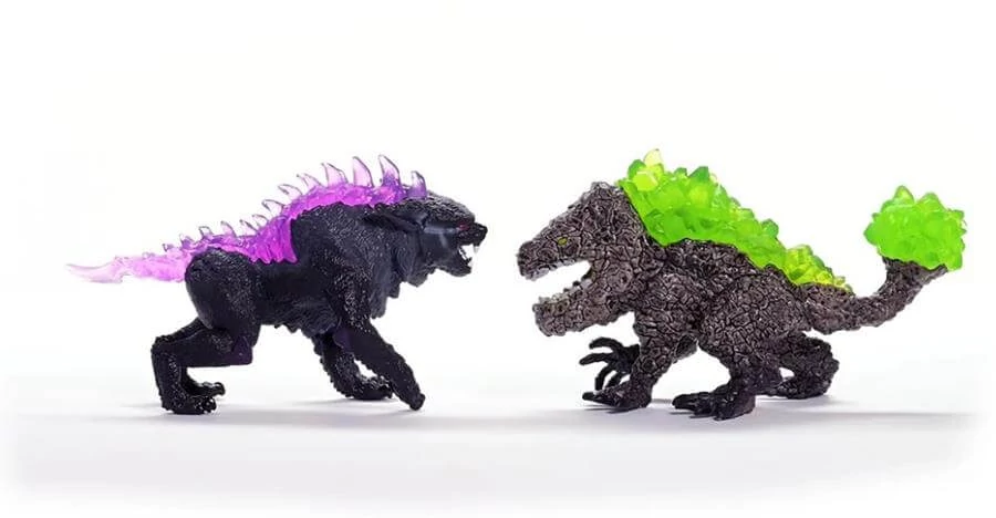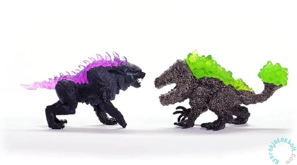 Ismerd meg a Schleich 70827 Árny hiúz vs. Kőtörő játékszettet. Messziről is hallani a harcot: Az Árnyék Hiúz dühösen sziszeg, míg a Sziklatörő mély morajlást hallat. Ami fenyegetően hangzik, az veszélyesnek is néz ki. Az Árnyék Hiúznak cakkos taréja van éles kristályokkal a hátán, és a Sziklatörő az erős farkával csap le. Ehhez borotvaéles kristályok vannak rögzítve. Segítség!