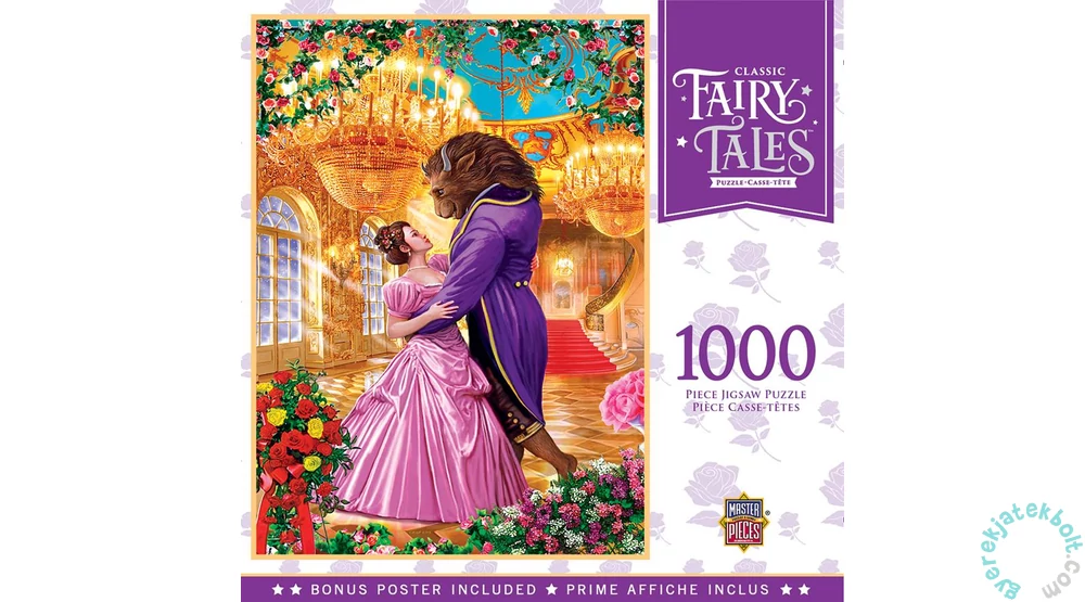 A MasterPieces 1000 db-os puzzle - Beauty and the Beast című képen a tündérmesék híres karakterei, Szépség és a Szörnyeteg látható.