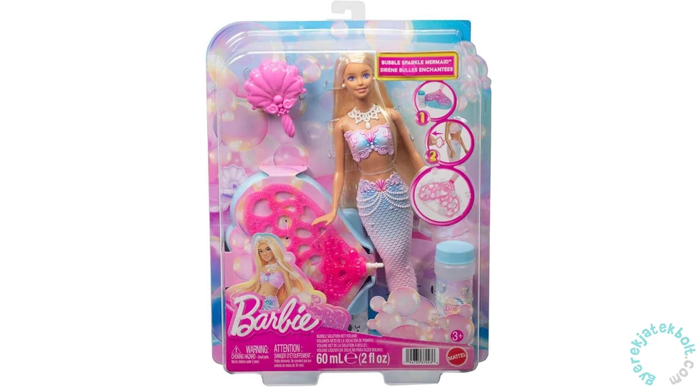 A Barbie Dreamtopia Buborékvarázs Sellő (JLW56) babákkal a gyerekek könnyedén elmerülhetnek a varázslatos mesék világában, ahol a Buborékvarázs sellő különleges élménnyel gazdagítja a játékot. Tündérmesébe illő megjelenése és egyedi uszonya az óceán igazi sztárjává teszi, miközben a buborékkészítő funkció új szintre emeli a szórakozást. A csomagban található buborékfolyadékot a kagyló alakú tálkába öntve, majd az uszonyt belemártva és a csípőjén lévő kagylót meghúzva rengeteg buborék varázsolható elő. A csodás, óceán ihlette kagylós részletek, a fenséges fejdísz és a hosszú, fantasztikus haj játék közben inspirálja a gyerekek képzelőerejét, miközben Dreamtopia világában életre kelnek a legszebb álmok. A sellő baba vízben és szárazföldön is izgalmas játékélményt nyújt, fejlesztve a fantáziát és a kreativitást.