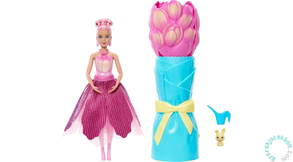 A Barbie Reveal Tulipáncsokor különleges meglepetéseket rejt. A gyönyörű tulipáncsokor formájú csomagolás varázslatos ajándék minden alkalomra. A szirmok eltávolításával meglepetés tasakok bukkannak elő, köztük egy kis öntözőkanna. Ha a csokrot meglocsolják, előtűnik egy illatos Barbie baba, akit a visszahelyezett csokorral újra és újra elővarázsolhatnak. A baba megjelenése a kiegészítőkkel személyre szabható, és a csokor meleg vagy hideg vízzel a színét is változtatja. A készlet egy Barbie babát, kiskedvencet és további kiegészítőket tartalmaz. A baba önállóan nem áll meg.