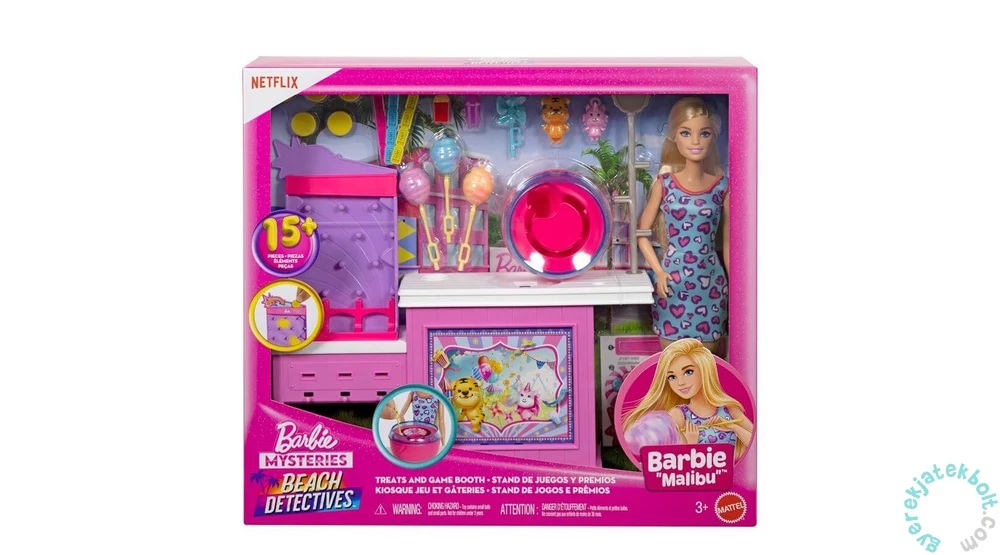 Barbie imádja a napfényt, a tengerpartot és a mesés történeteket. A gyerekek pedig vele lehetnek ezzel a Barbie Mysteries: Beach Detectives vattacukor standdal. A sorozat által ihletett készlet és a szőke, csodás szívecske mintás ruhát és fehér sportcipőt viselő Malibu Barbie egy menő tengerparti sétányra repítheti a történeteket. A standon vattacukor készítéssel és egy szuper játékkal várja a vendégeket. A húsz tematikus kiegészítő - köztük a játékzsetonok, nyeremények enni és innivaló - fantasztikus történeteket inspirálhatnak. A gyerekek újrajátszhatják kedvenc rajzfilmes jeleneteiket vagy újakat találhatnak ki ezzel a szuper készlettel.