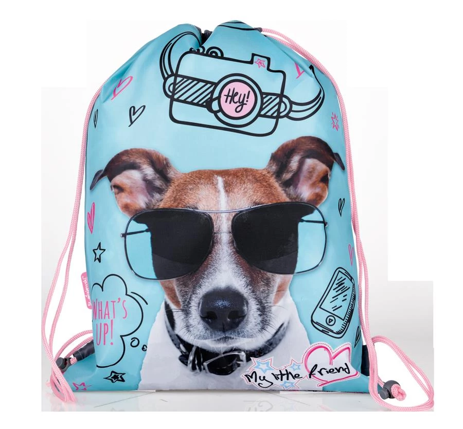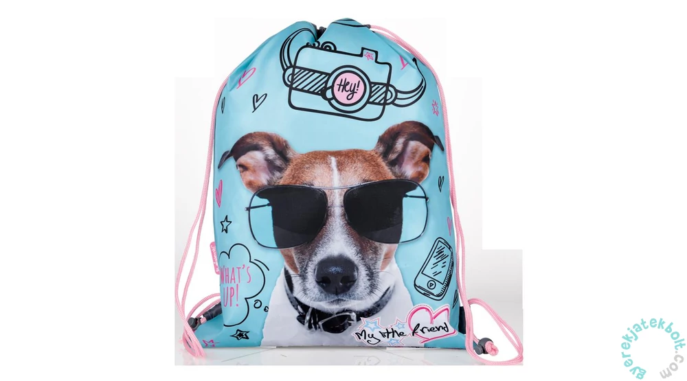 A My little friend kutyás tornazsák elején vagány napszemcsis kutyus képe látható. A teteje madzaggal szűkíthető, hátoldalán kis vonalas rész található a név és a lakcím feltüntetéséhez.