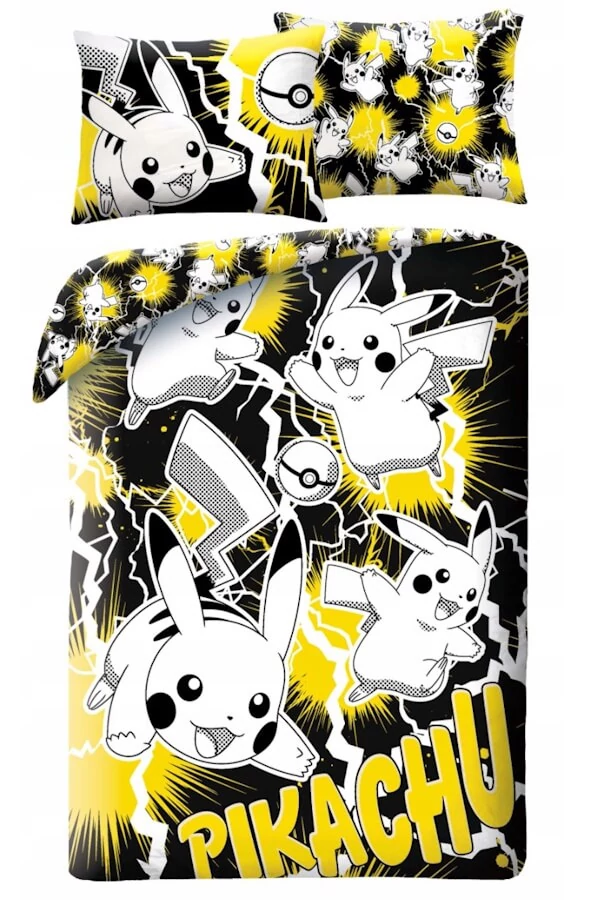Energiával teli, Pokémon mintás ágyneműhuzat ikonikus sárga-fekete Pikachu grafikával, igazi rajongóknak. A kétrészes ágynemű garnitúra 1 db 140 × 200 cm-es paplanhuzatot és 1 db 70 × 90 cm-es párnahuzatot tartalmaz. A cipzáras és kétoldalas mintázatú huzatok látványosak és praktikusak. A mikroszálas anyag puha, könnyű és tartós, így kényelmes használatot biztosít.
