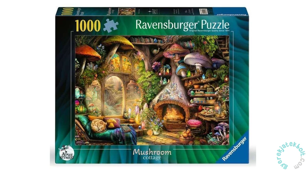 A Ravensburger A gomba kuckó (12001525) című képe Aimee Stewart alkotása. Ebben a varázslatos erdei kunyhóban kellemes harmóniában fonódik össze a fantázia és a természet. Kuckózz be a gombák, kristályok, könyvek és növények közés és fedezd fel a puzzle érdekes apró részleteit!
