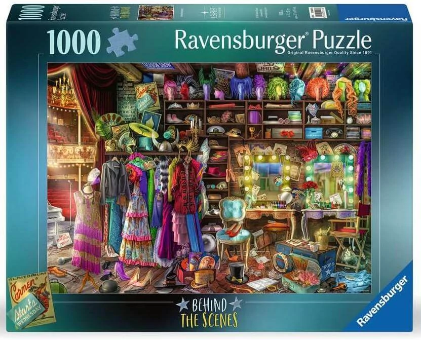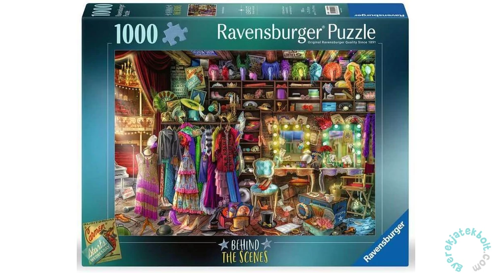 A Ravensburger 1000 db-os puzzle - A szinház kulisszái mögött kirakott képén egy igazán színes világ tárul elén, ami a kulisszák mögött vár. A színházi élet összes színe és jelmeze előbukkan ezen a kirakón.