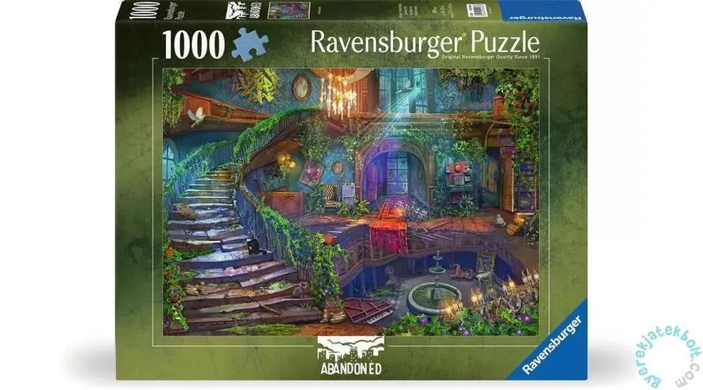Ezen a Ravensburger 1000 db-os puzzle - Abandoned - Hotel Vacancy (12000486) kirakón egy régi, ma már elhagyatott szálloda látható. Az előcsarnok évekkel ezelőtt még a fényűzésben tündökölt, de ma már graffitivel és szeméttel van tele. A szálloda stílusa és hangulata még ma, hosszú idő távlatából is magával ragadja az embert.