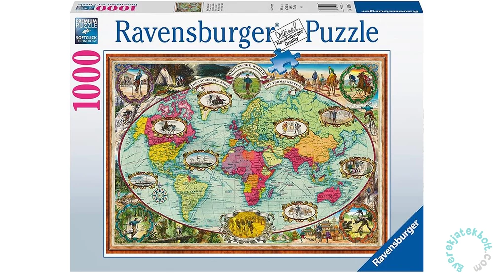 A Ravensburger 1000 db-os puzzle - Biciklivel a világ körül című világtérkép Thomas Stevens merész vállalkozásának állomásait mutatja be, aki 1884 áprilisában biciklivel akarta körbejárni az egész bolygót. A Föld körüli túrája sikeresen zárult és 3 évig tartott.