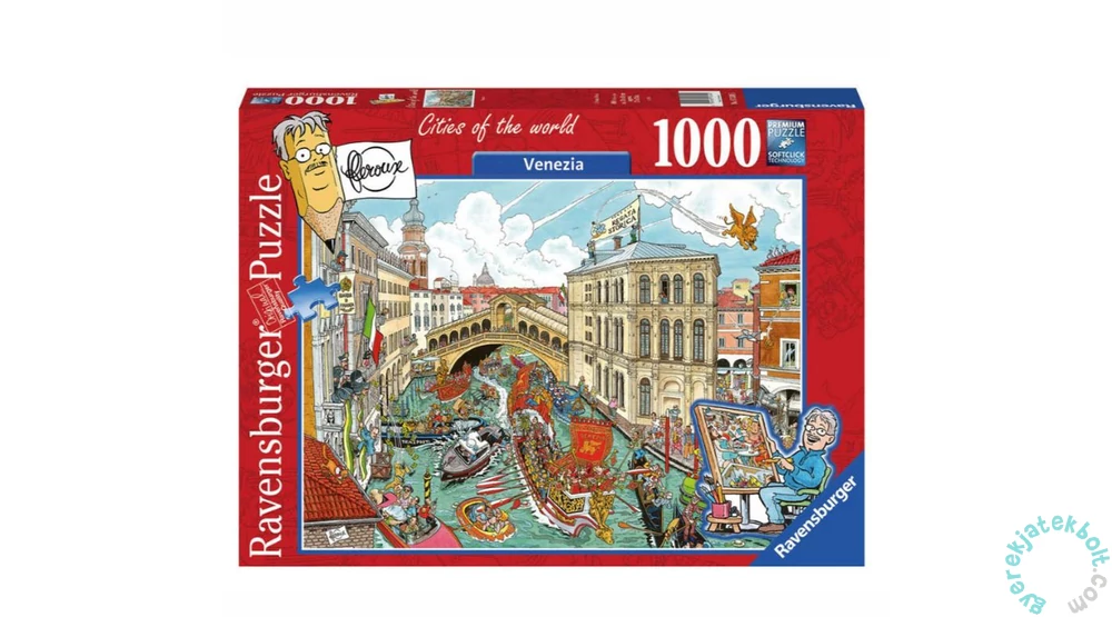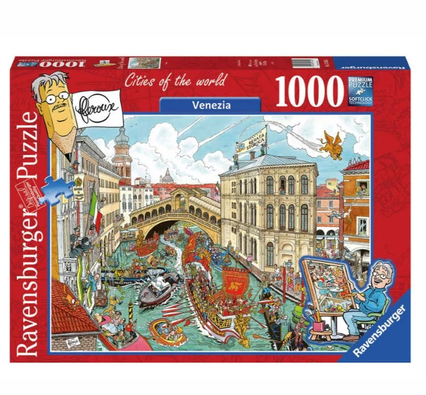 A Ravensburger 1000 db-os puzzle - Cities of the World - Velence (17534) képén a francia belváros túlzsúfoltsága látható, Frans Le Roux illusztrációja alapján.